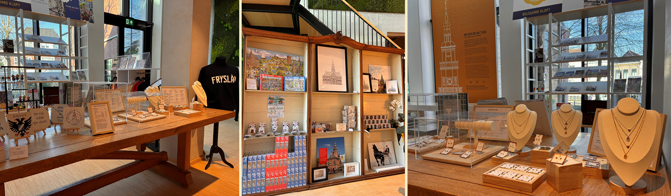 In de centrale hal van De Tiid is een museumwinkel ingericht. Je vindt hier originele en verrassende items, leuk als cadeautje voor jezelf of een ander. Zo is er een groot assortiment handgeschilderde tegels die speciaal voor het museum gemaakt zijn. Verder vind je er ansichtkaarten en posters van het stadhuis, die met of zonder lijst te koop zijn. En wat dacht je van de prachtige collectie sieraden, gemaakt door Dutch Jewelry? Kettingen, ringen, oorbellen en armbandjes met bedeltjes van Fryske hynders, pompeblêdsjes, racefietsjes en nog veel meer.